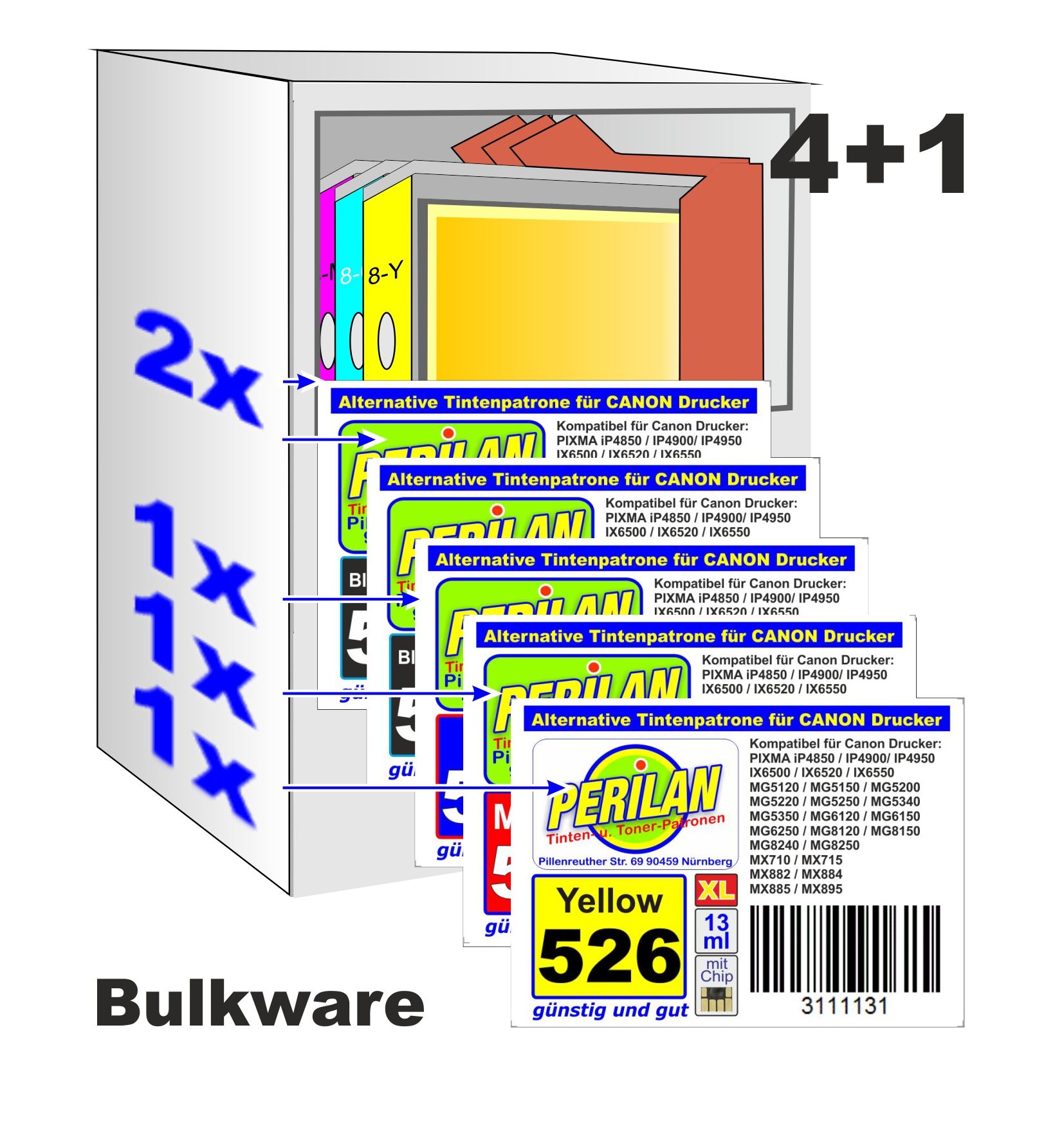 PGI-525 - CLI-826 Multi, 5 alternative XL Tintenpatronen 2xBK/1xC/1xM/1xY, 2x Schwarz je 25 ml, Color je 13 ml. mit Chip, ohne Photo Grau und Photo Schwarz, EAN: 3111130
